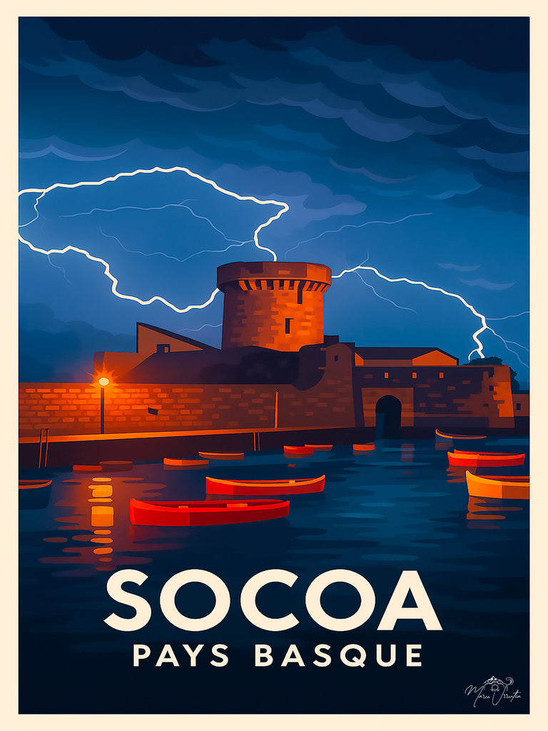 Plongez dans l’atmosphère unique du Pays Basque avec cette affiche artistique inspirée d’une photographie originale.